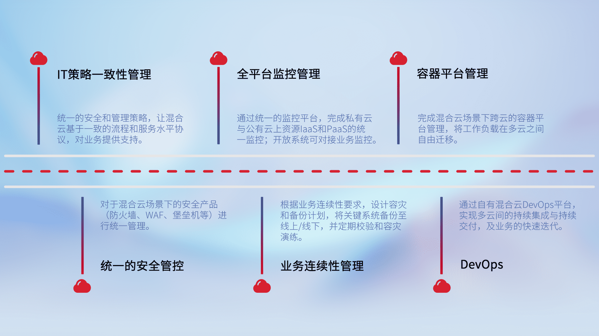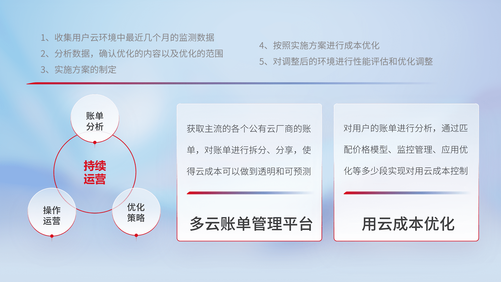 通过多云纳管,,,以统一的资源数据模型把客户的云资源进行抽象和封装,,进而实现对多云资源的统一操作,,保障云资源管理的可靠性、、稳定性与可用性。。。。量身定制化运维内容,,,,配置、、、开发运维、、补丁管理、、备份、、监控、、、认证和访问管理、、、、审计和日常巡检等,,保障在用云过程中的可靠度,,,,稳定度以及高可用率。。