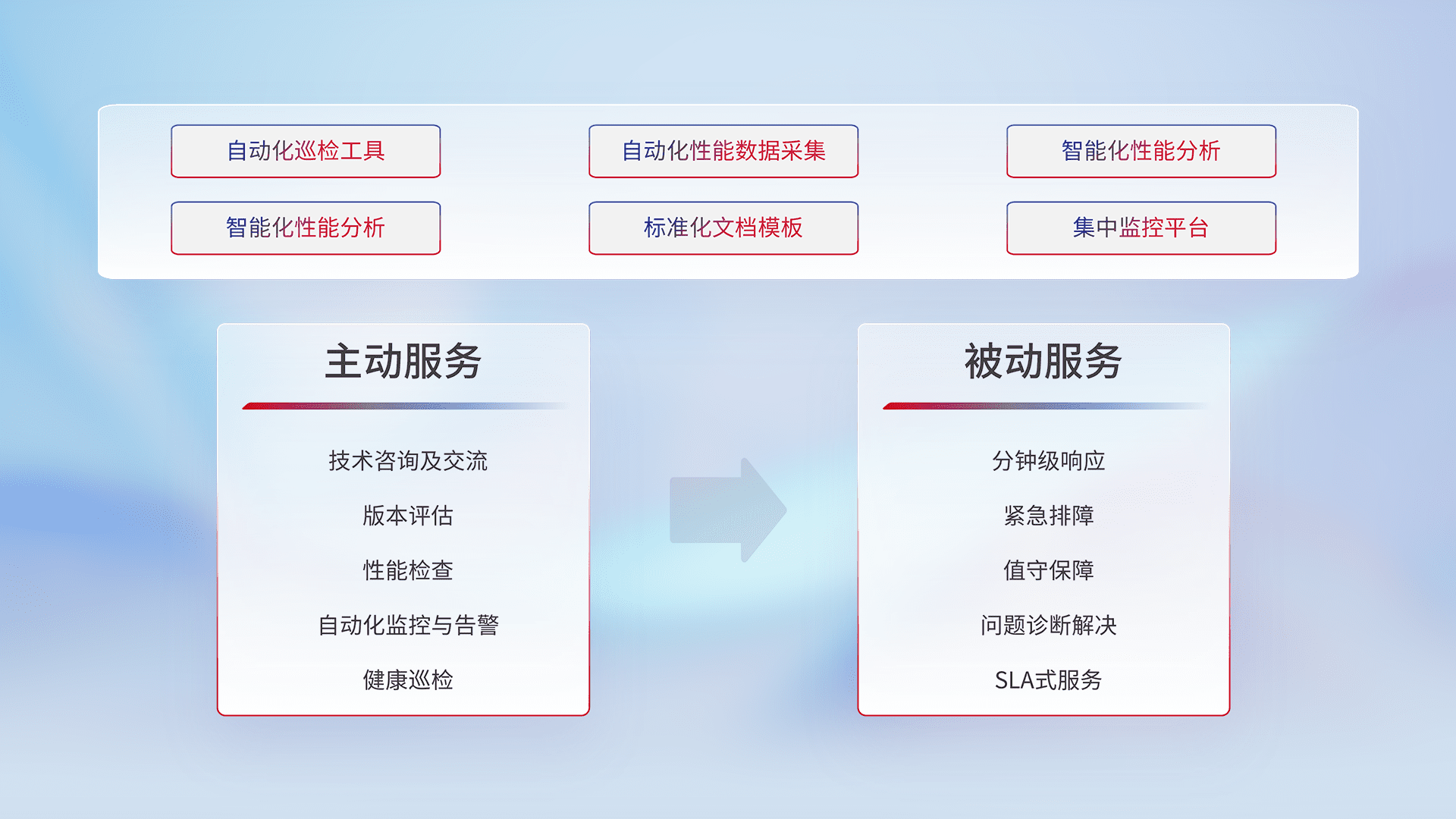 智能化工具和标准化文档,,保障服务质量,,提供主动服务(包含技术咨询、、、、版本评估、、性能检查、、、自动化监控与告警、、、、健康巡检)和被动服务包含(分钟级响应、、、、紧急排障、、值守保障、、问题诊断解决、、SLA服务)。。